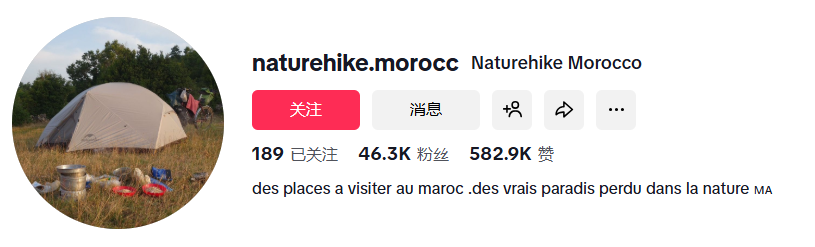 例如面向摩洛哥市场所开设的TikTok账号@naturehike.morocc,截至目前,已经拥有4.63万粉丝,获赞量为58.29万,在所有区域账号中表现最为突出。