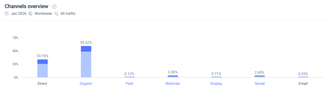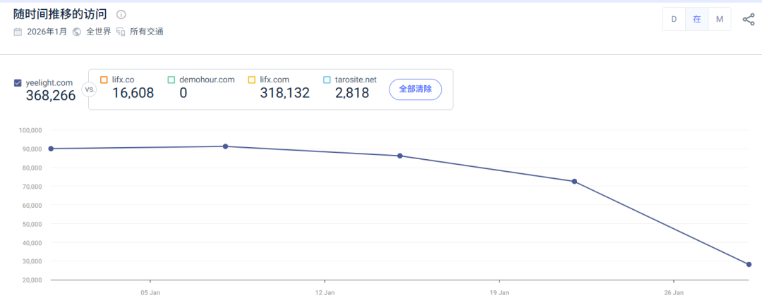 线上,Yeelight深耕独立站,SimilarWeb数据显示,2026年1月独立站月访问量超36.8万次,其中,直接流量占比达33.76%,有机流量占比达59.52%。