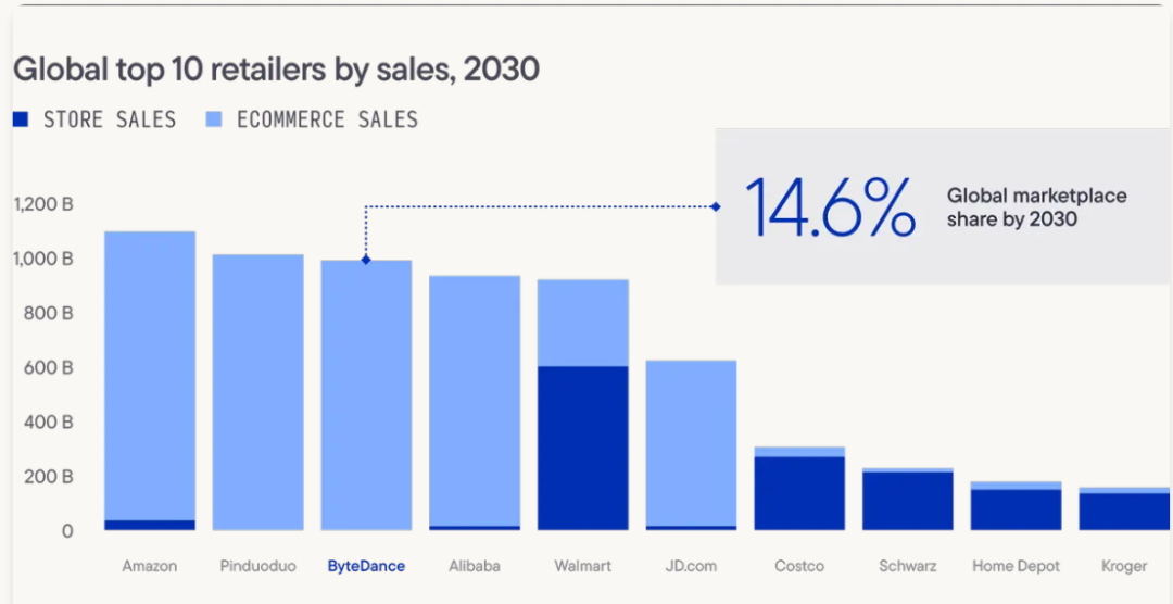 到2030年,字节跳动在全球电子商务销售额中的市场份额将达到14.6%,跃升为全球第三大零售商,推动约1万亿美元的销售额。