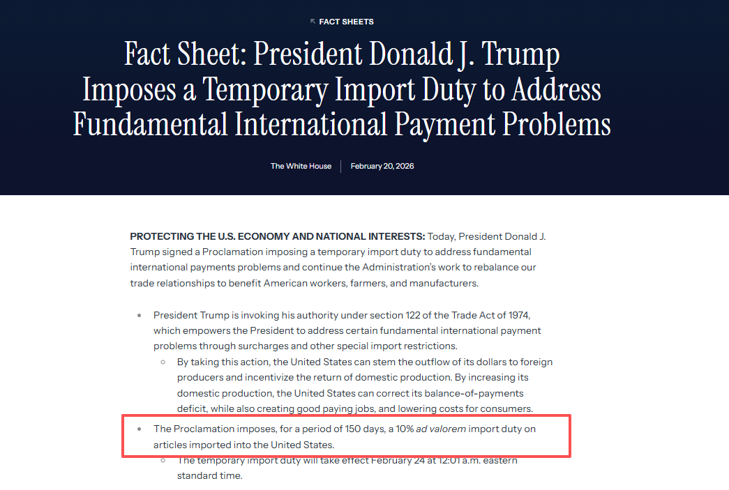 旧关税大棒刚被裁定违法,特朗普当天便祭出新招——援引《1974年贸易法》第122条的权限,签署行政令宣布:自2月24日起,对所有国家和地区的商品,加征10%进口关税,为期150天。