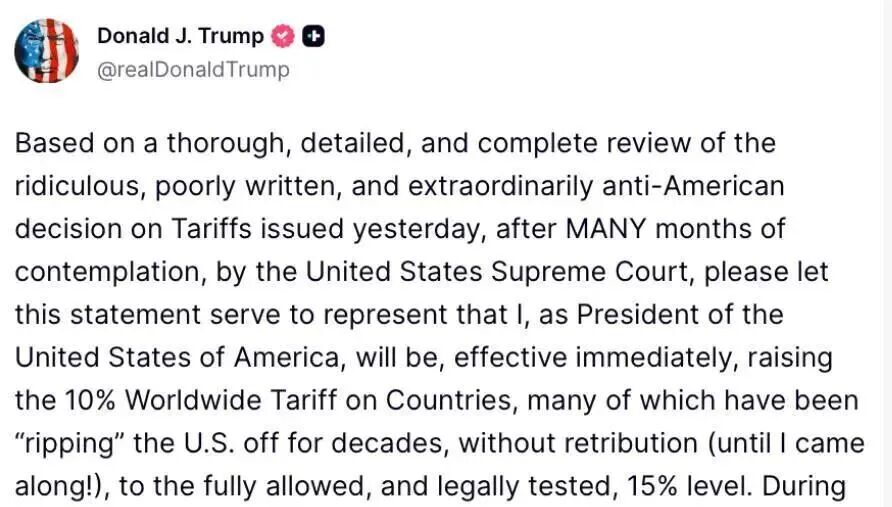 仅隔一天,即2月21日,特朗普又在社交平台发文,扬言将新关税税率从10%上调至15%。