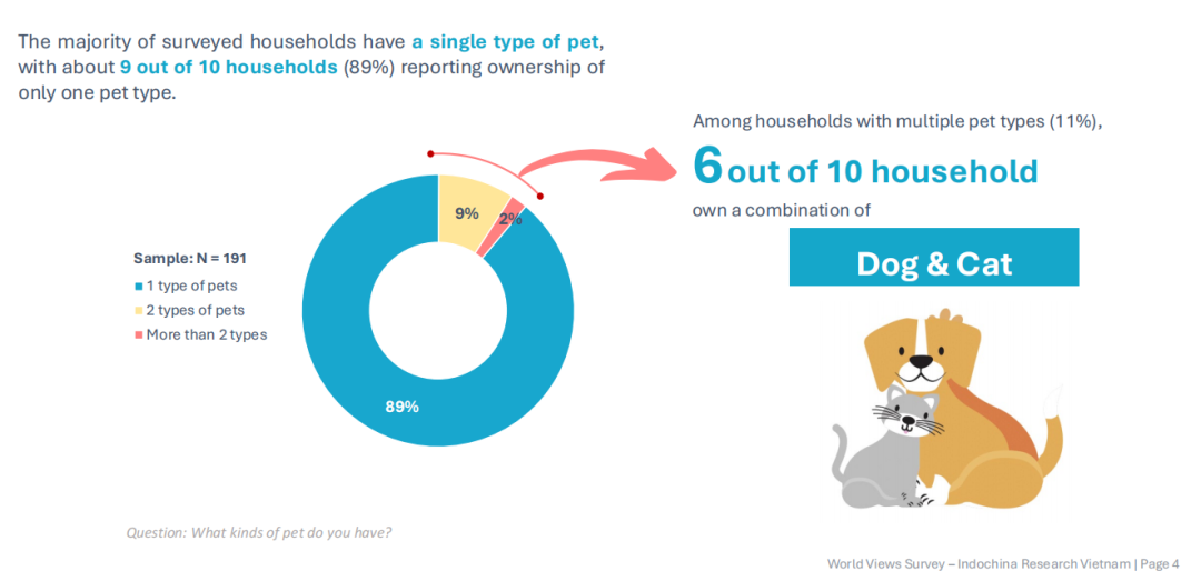 单宠饲养为主流,多宠饲养处于萌芽阶段。越南养宠家庭的宠物组合以“单一类型”为绝对核心:
