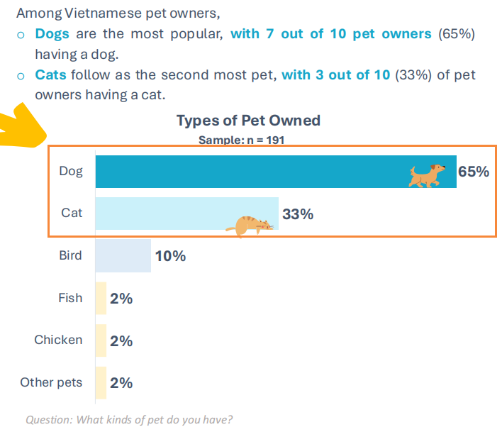 整体养宠渗透率偏低,市场空白空间巨大。越南城市家庭的宠物拥有率仅为21%,79%的家庭无宠,这一比例远低于欧美(60%以上)及中国一线城市(50%左右)的养宠渗透率。调研样本中900位受访者仅191位为宠物主人,说明越南宠物市场仍处于用户教育与需求培育的初期阶段,未来增长潜力显著。