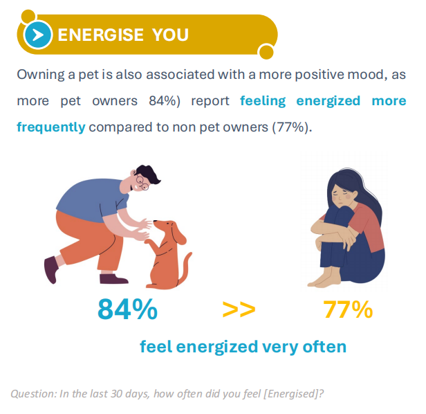 84%的宠物主人表示“在过去30天内经常感到精力充沛”,而非宠物主人的这一比例为77%。