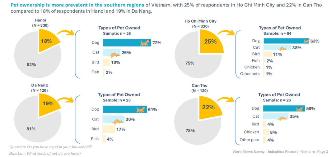 Indochina Research发布的2025越南宠物所有权报告,聚焦越南城市养宠群体,样本覆盖北部、中部、南部(河内、胡志明市、岘港、芹苴)关键城市,精准勾勒出越南城市养宠的核心特征。