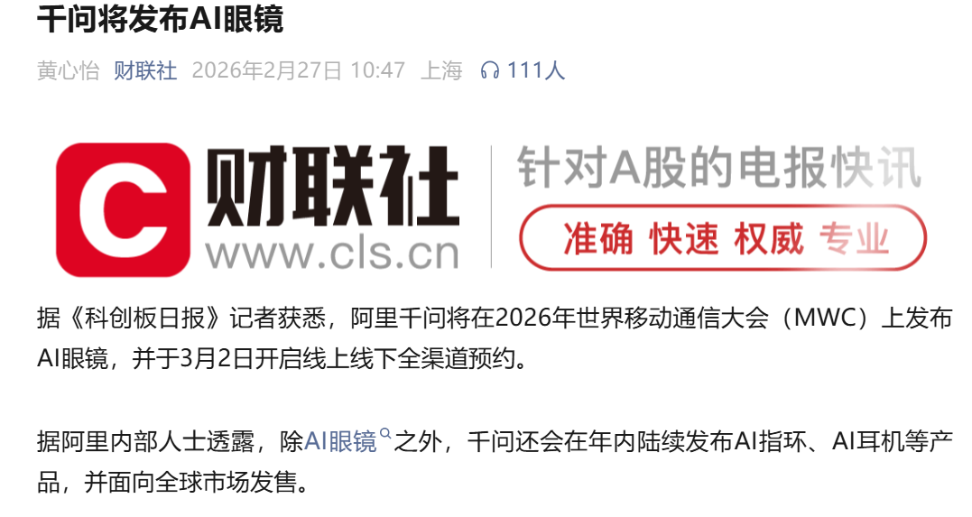 2026年2月27日,财联社突发消息:阿里千问将在2026年世界移动通信大会(MWC)上发布AI眼镜,并于3月2日开启全渠道预约。这还不是全部——据阿里内部人士透露,千问年内还将陆续发布AI指环、AI耳机等产品,面向全球市场发售。