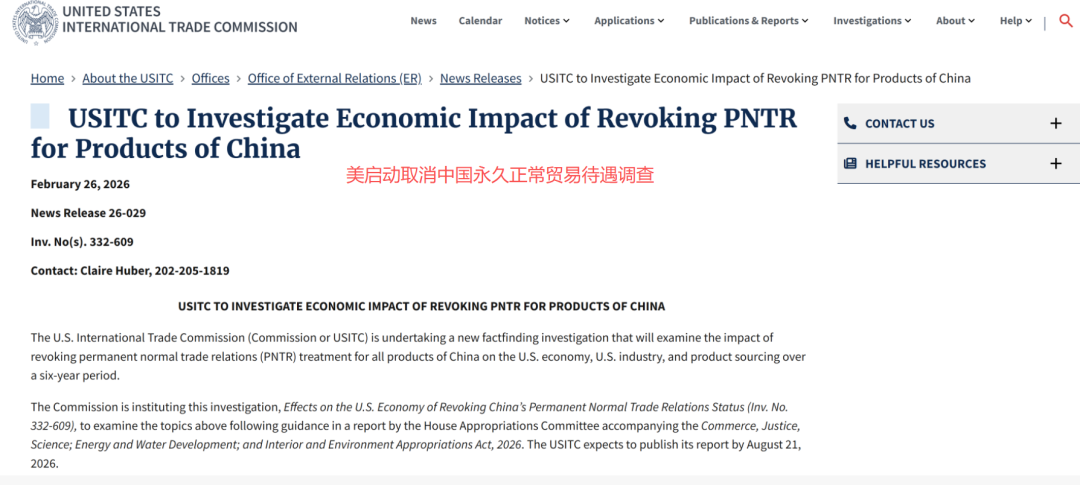在此背景下,此次 USITC 正式启动相关调查,也被视为美方再度推进对华贸易政策调整的重要动作。