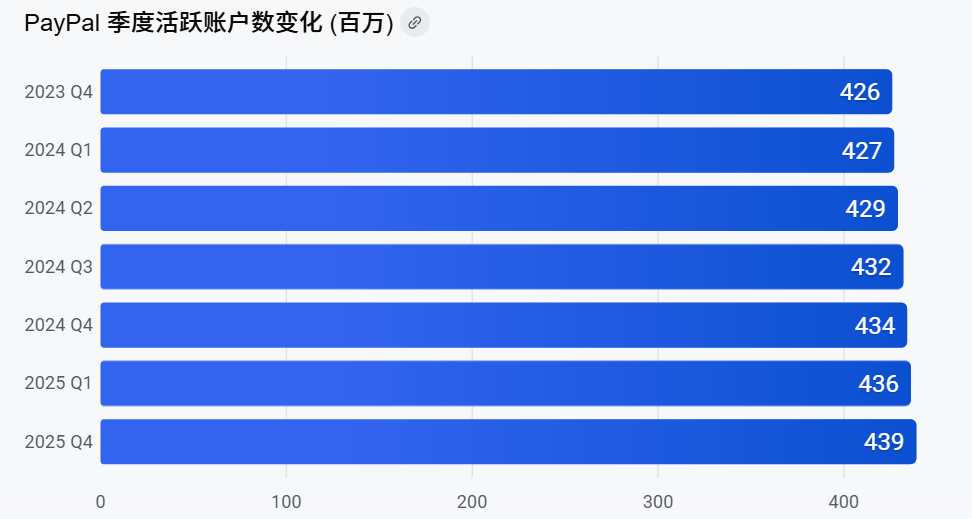 数据显示,截至2025年底,PayPal全球活跃账户达4.39亿,其中商家账户超过3500万。2025年第四季度,其支付总额(TPV)攀升至4751.4亿美元,处理交易68亿笔,平均每个活跃账户在过去12个月内完成了约60.6次交易。