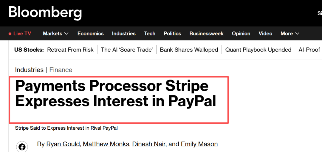 2026年2月24日,彭博社披露,全球支付巨头PayPal可能面临被收购。消息传出后,PayPal股价两个交易日累计上涨13%。
