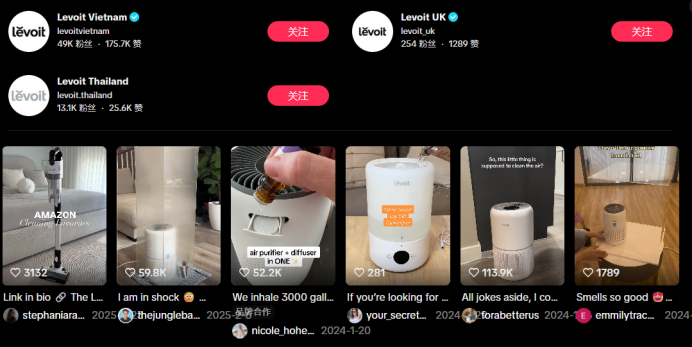 在TikTok上,Levoit开通了越南、泰国、英国等多国TikTok品牌官方账号,累积粉丝上万。其中,#airpurifier(空气净化器)标签下作品有24.34万篇,#Levoit标签下的视频超2.42万条,相关搜索词很多,且视频播放与点赞热度很高。