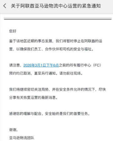 亚马逊已通知暂时停止在阿联酋的运营,