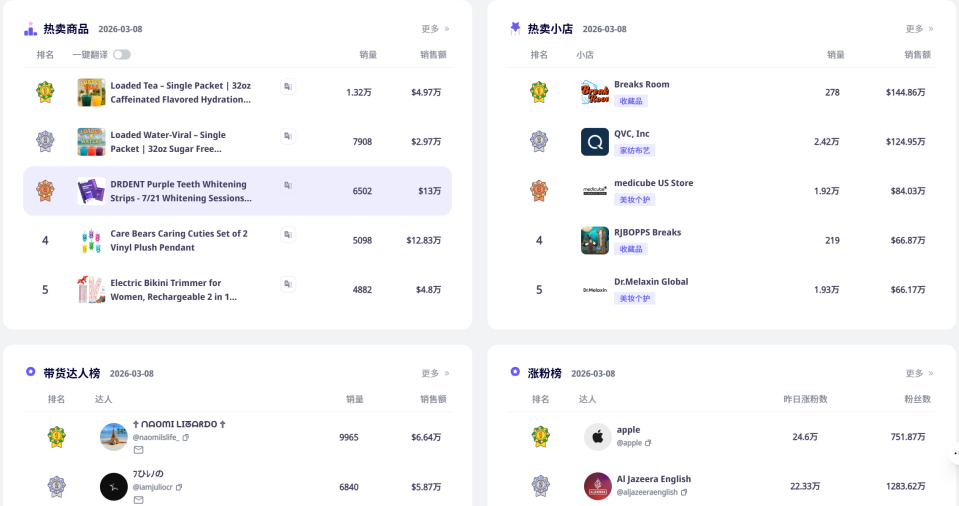 而在这个过程中,用数据工具往往能帮你少走很多弯路。比如通过观察平台热门商品、热视频趋势和类目变化,可以更快判断哪些产品正在起量,哪些赛道还有空间。