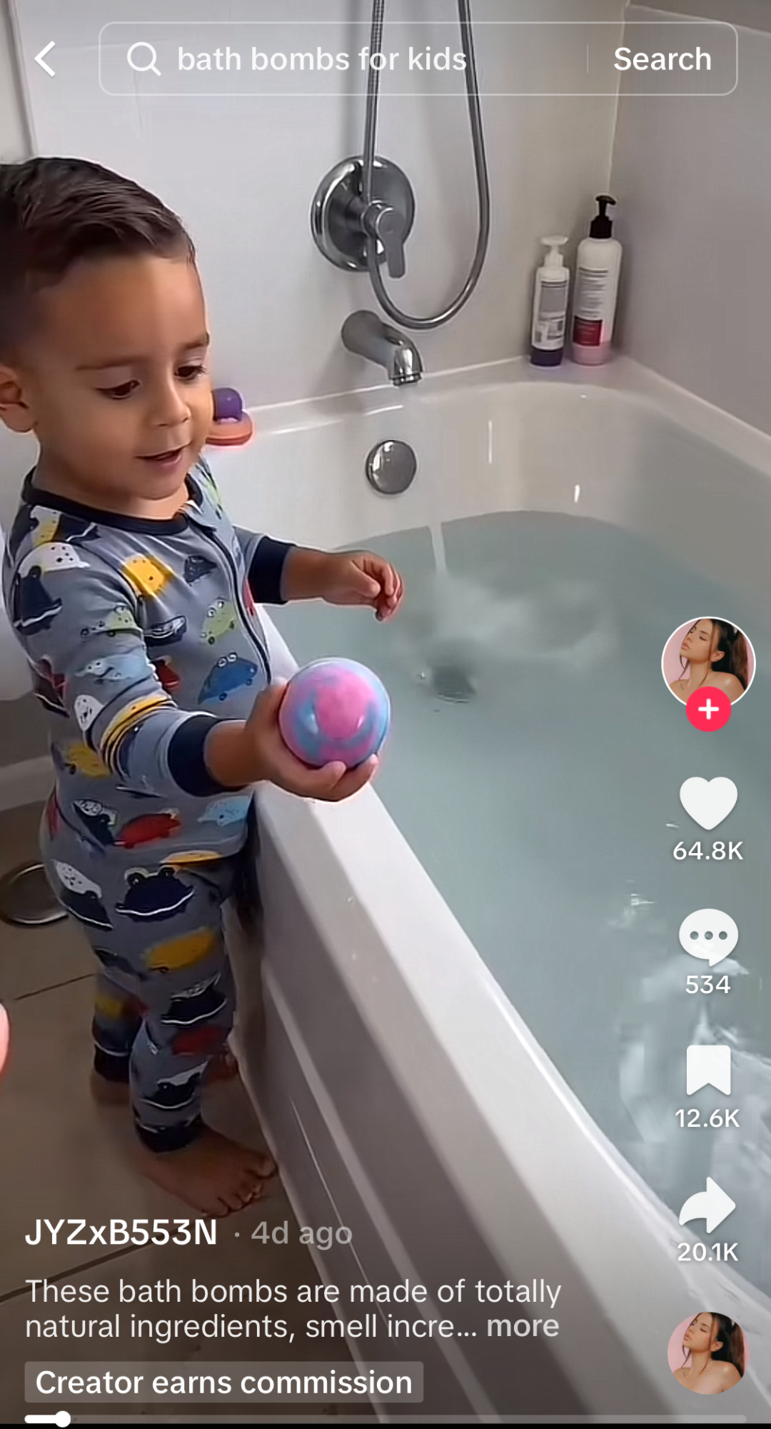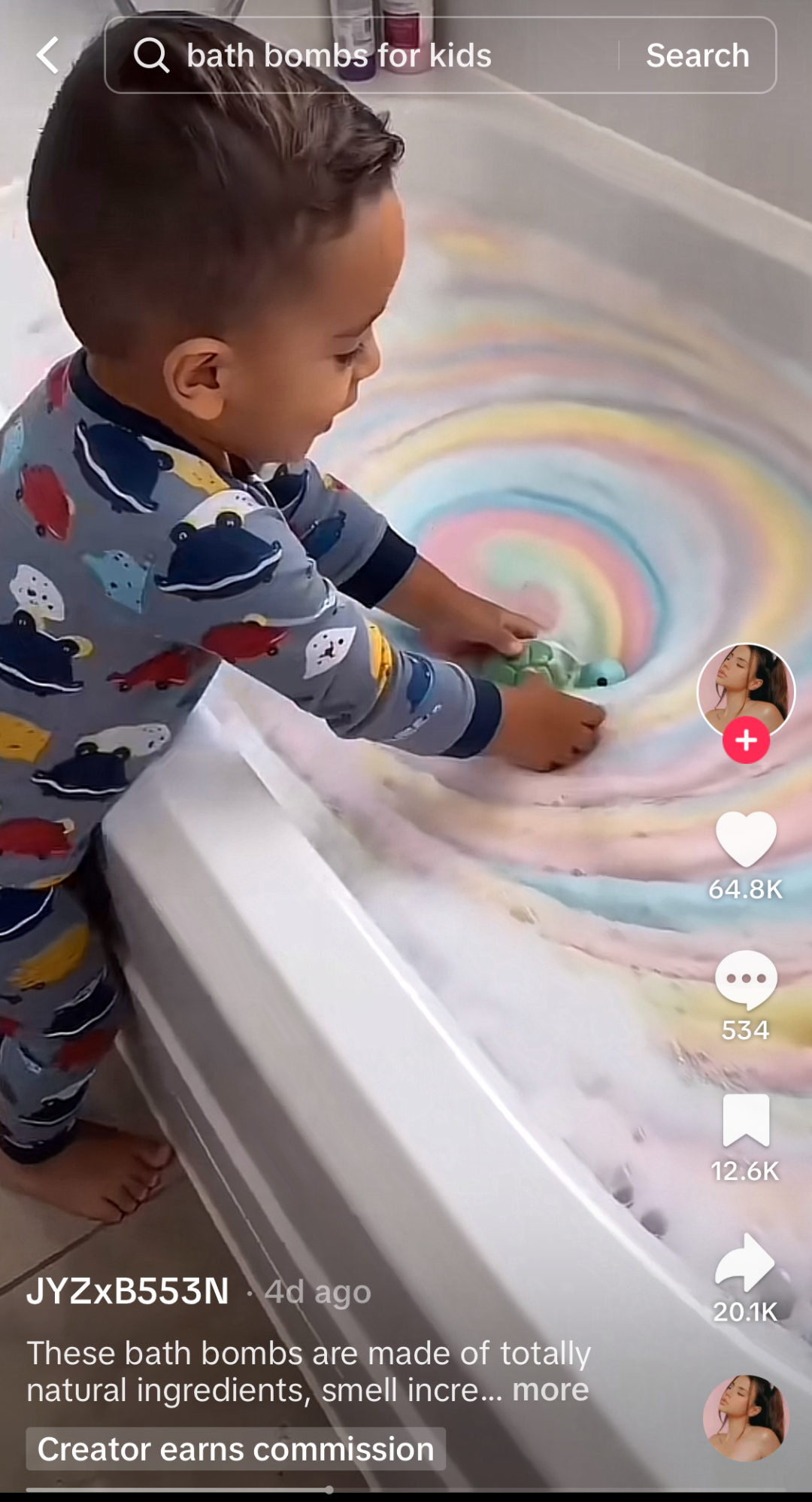 视频中,一个穿着可爱睡衣的小男孩站在浴缸旁,将一枚彩色浴盐球放入水中。浴盐球在水中迅速溶解,释放出彩虹般绚烂的泡沫,最终露出一只绿色的小海龟玩具,小男孩看到玩具后,开心地发出惊叹和欢呼,画面充满童趣与感染力。