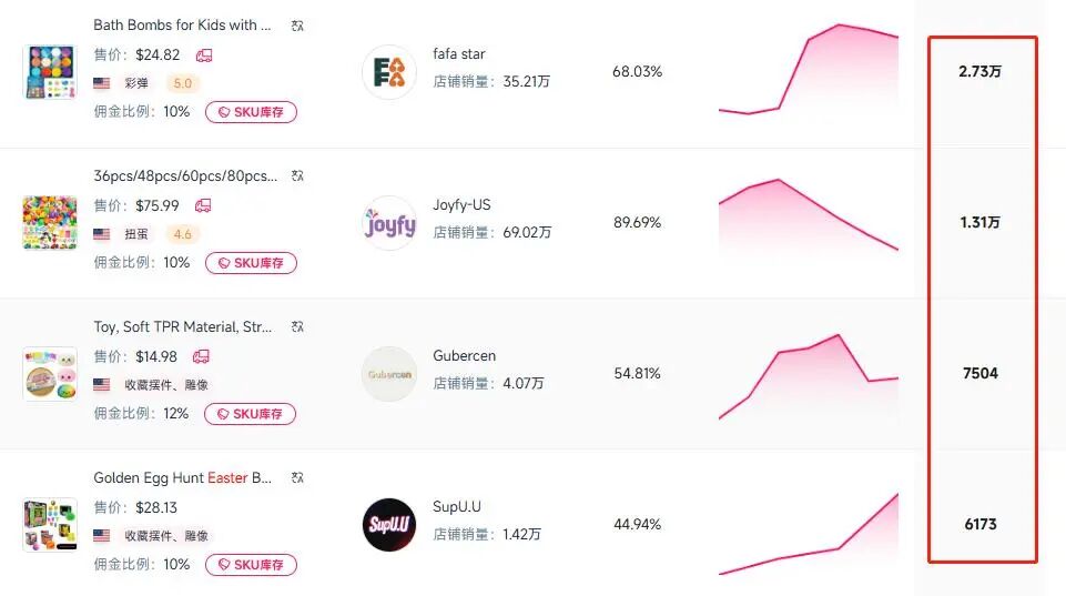 其中,复活节主题玩具彩蛋表现尤为亮眼,该产品2024年上架,近30天已卖出5.79万单,总销售额达191.56万(约合人民币1321万元)。