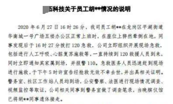 2020年6月27日,深圳龙岗区华南城,跨境大卖*拓科技员工胡某某在正常上班时,突然从座位上栽倒在地。同事立即拨打120,并进行人工呼吸和心脏复苏,急救人员赶到后抢救无效,宣告其不幸离世。