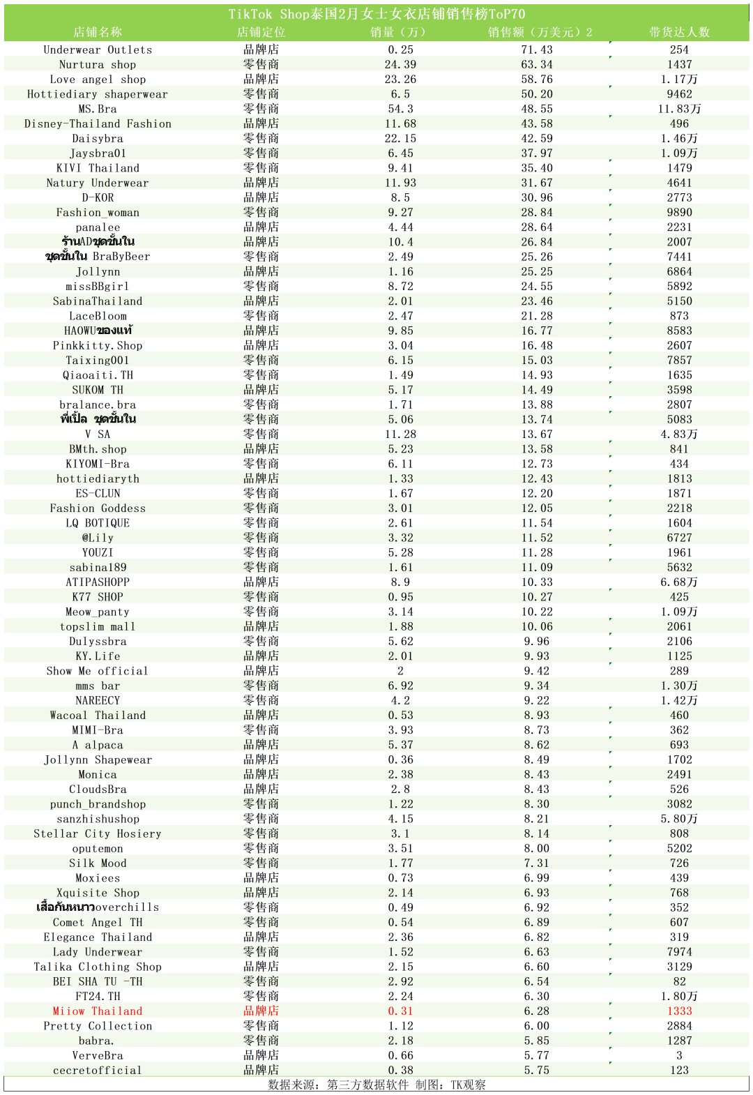 就TikTok泰国二级类目女士内衣店铺销售榜来看,@MiiOW Thailand店铺位列第66位,虽位列畅销榜末尾,但其产品单价却极具竞争力。TK观察发现,在TOP70店铺中,仅排名第一位的@Underwear Outlets(主营CK等国际知名品牌)内衣单价高于猫人,其余绝大多数店铺的内衣单价均低于猫人品牌,这直观的表明,在普遍追求性价比的TikTok泰国,MiiOW已凭借“科技内衣”定位成功跳脱出低价竞争区间,建立起属于店铺的品牌声量优势。