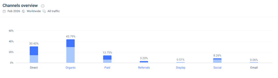 从流量渠道构成来看,自然搜索占比高达43.79%,直接访问占比30.43%,两者合计超过74%。这意味着超过七成的用户是通过主动搜索品牌词或直接输入网址进入网站的。