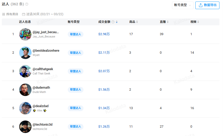 过去30天内,SUNLU品牌店铺合作联盟达人产生的成交金额中,排名前六的达人贡献了从1.26万美元到2.98万美元不等的销售额。