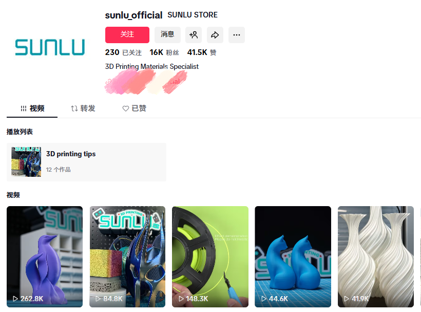 SUNLU品牌的官方账号@sunlu_official目前拥有1.6万粉丝,累计获赞4.15万次。账号内容不局限于单纯的硬广,而是持续输出打印过程、材料特点、用户作品以及实用技巧。