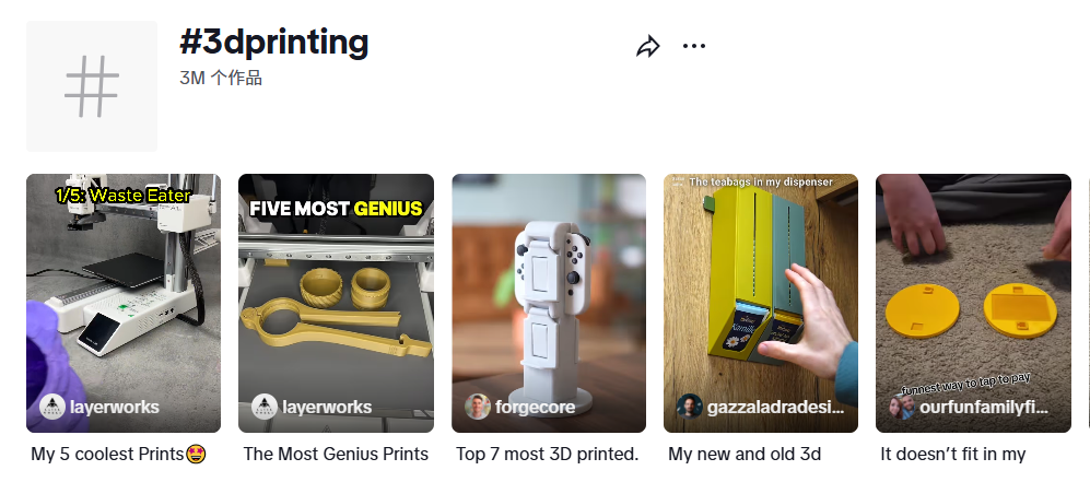 这个选择其实也不意外,从某种意义上讲3D打印与短视频是天生合拍的一种组合。这种“从无到有”的创造过程具有极强的视觉冲击力,在TikTok上有着很大优势。