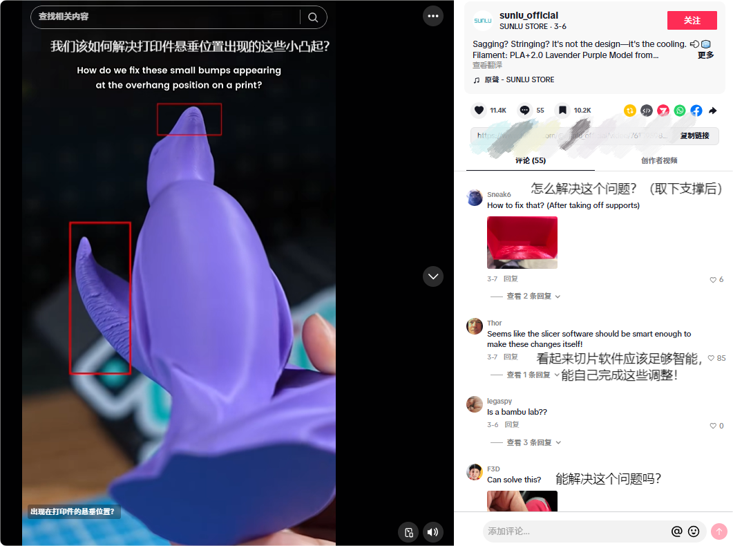 比如在近期一条视频中,他们用SUNLU PLA+2.0薰衣草紫色线材打印模型时,直观展示了“层间冷却不足导致的层纹塌陷”问题,并给出了原因分析。