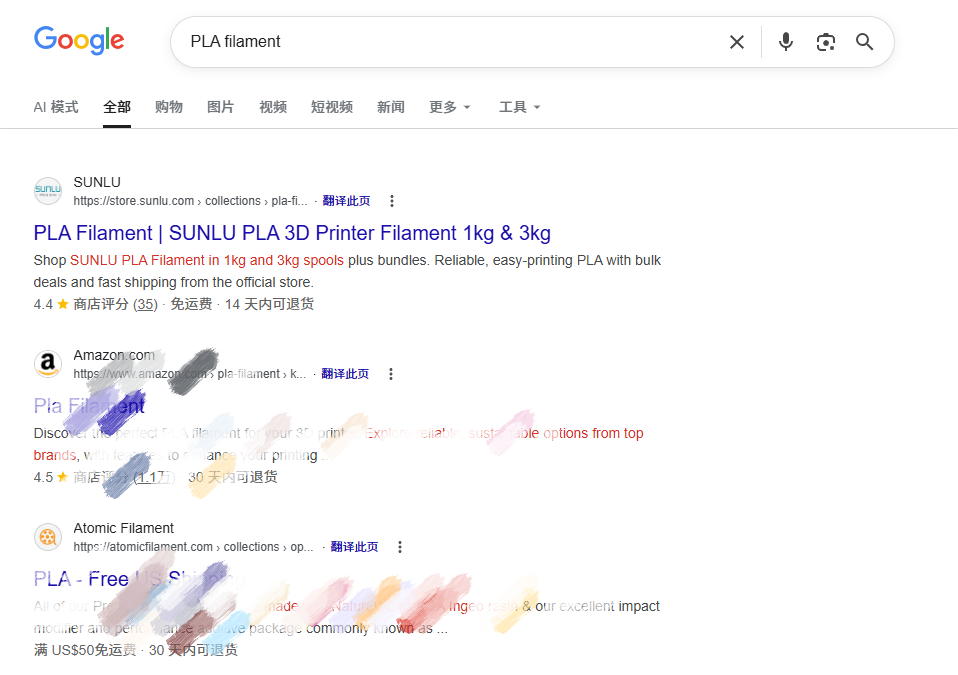 比如,我们在Google搜索“PLA filament(PLA 耗材)”这类核心品类词时,SUNLU的官方独立站就出现在搜索结果首页前列,让用户能够第一个点进去。
