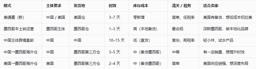 中国 / 美国主体 + 美国仓发 → 适合美国有库存、想低成本拓拉美墨西哥本土自运营墨西哥本地主体 + 本地仓 → 适合长期深耕、做品牌、冲类目头部中国主体跨境直邮中国主体 + 国内直发 → 适合轻小件、测款、低客单跑量中国→墨西哥海外仓中国主体 + 墨国第三方仓 → 适合有稳定单量、想提升时效的卖家美国→墨西哥海外仓美国主体 + 墨国第三方仓 → 适合供应链在美国、深度布局拉美卖家