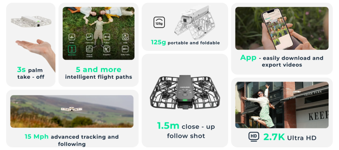 不同于大疆的发展路线,HoverAir自创立之初便聚焦用户日常拍摄需求,主打轻量化、全自动的飞行相机。凭借极简操作、极致便携与AI智能跟拍功能,其在大疆占据主导地位的无人机市场中走出了一条鲜明的差异化赛道,直接避开了与大疆的正面竞争。