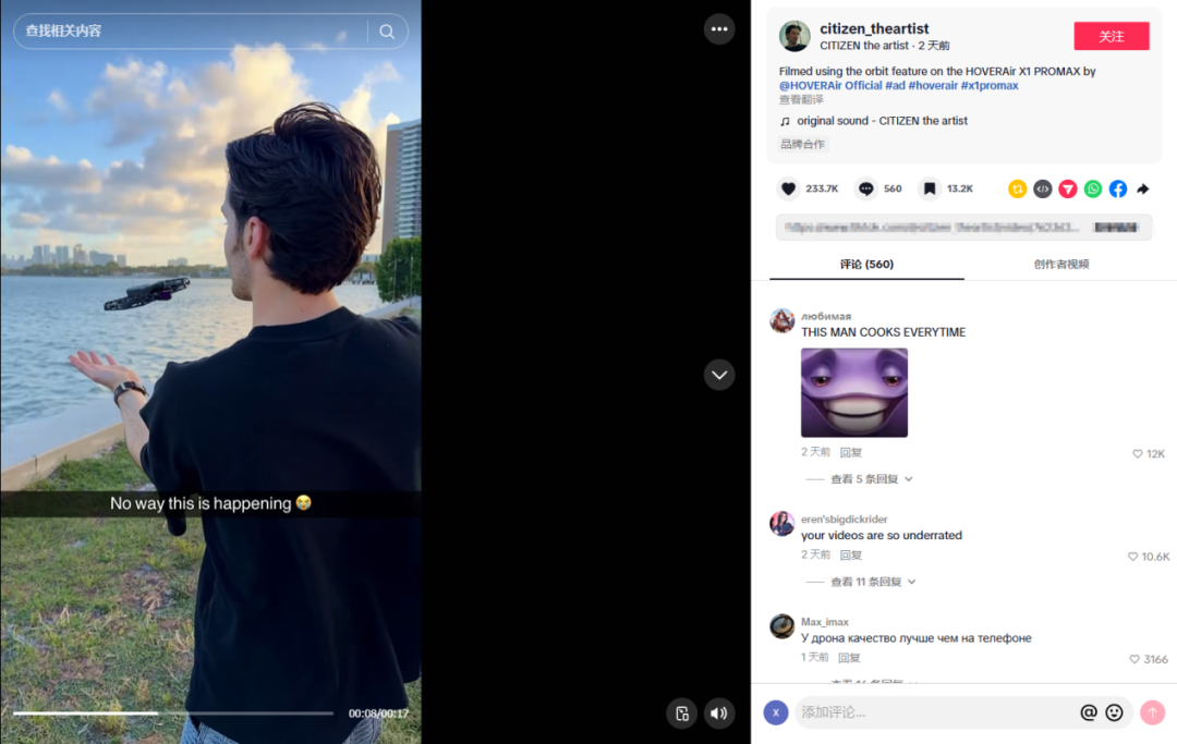 拥有29.46万粉丝的TikTok户外短片拍摄分享达人@CITIZEN the artist,就在2天前,刚为HoverAir打造了一支创意短视频。