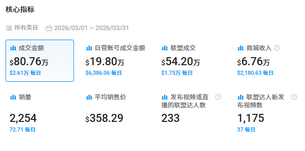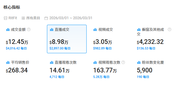 据公开数据,2026年3月,RitFit在TikTok美区小店的单月销售额约为80.76万美元,其中自营账号贡献约19.8万美元,达人合作成交额约54.2万美元,显示出品牌在“自营内容+达人分销”之间已经找到了相对平衡的节奏。