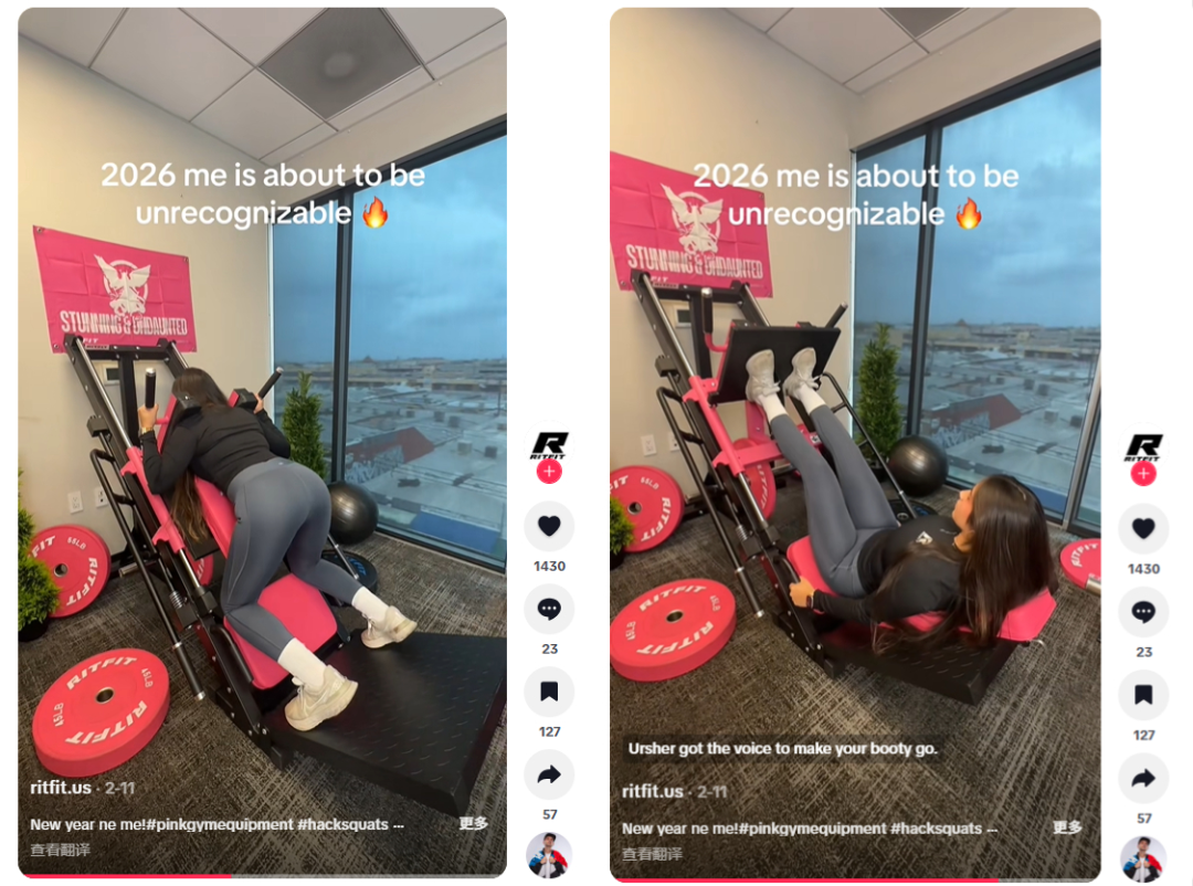 比如,他们在近期发布的粉色器材锻炼内容反响就很不错,通过女生出镜展示家用倒蹬机的使用场景,吸引了大量女性用户的关注和互动,该视频也获得了14万次播放。