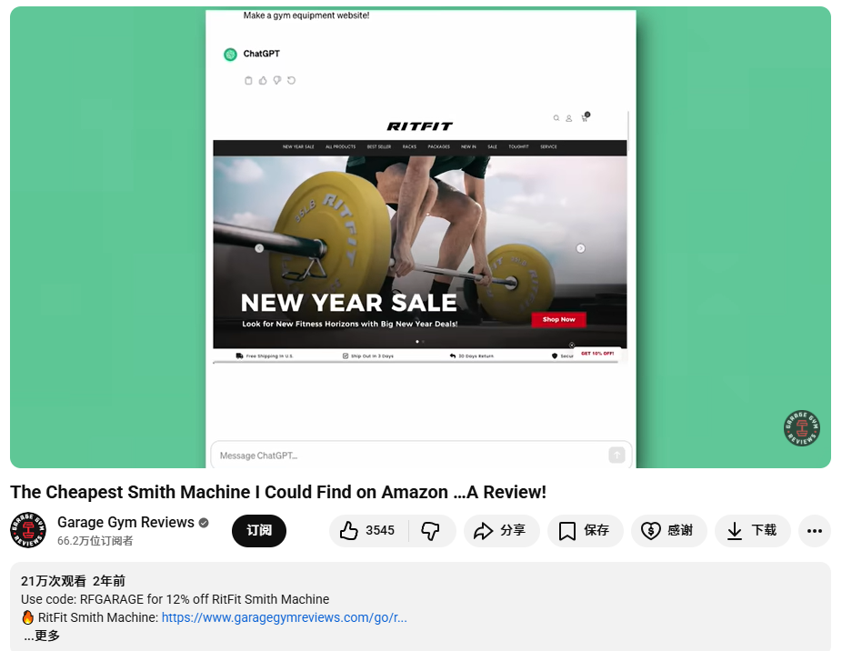 比如和Garage Gym Reviews的合作,这个频道有59.5万粉丝,专注家庭健身器材评测。合作内容里,博主用13分钟详细介绍了RitFit的PSR05史密斯架,标题直接起名为“The Cheapest Smith Machine I Could Find on Amazon”。