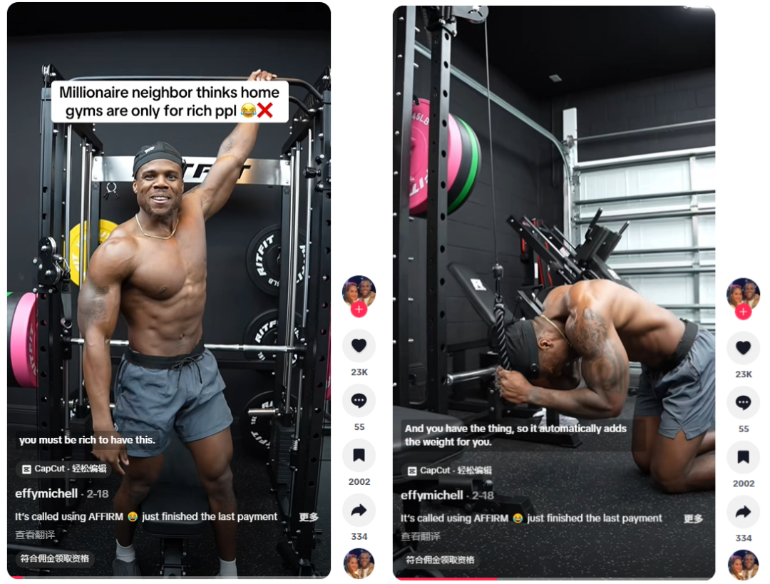 -@ritfit.us:粉丝约1.92万,内容更偏向真实家庭健身场景,通过视觉叙事,强化“家庭健身房”这一概念对普通用户的代入感。