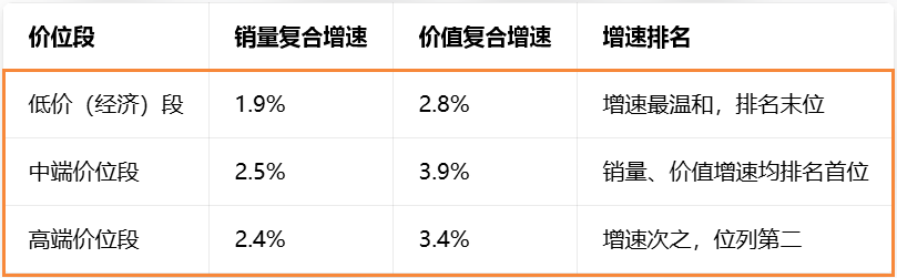 五年销量增速9.69%,复合增速1.9%,为三大价位段最低;价值复合增速2.8%,市场规模从247亿美元增至283亿美元,增长乏力。