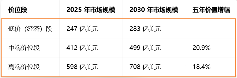 2025—2030年,低端经济、中端、高端三大价位段在销量与价值上呈现三维分化,清晰勾勒出市场增长格局。