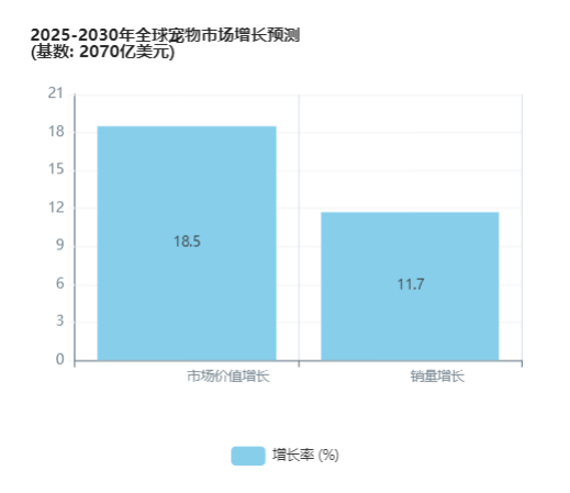 2025年全球宠物市场规模将达到2070亿美元,2025—2030年市场价值预计增长18.5%,而同期销量增长11.7%,