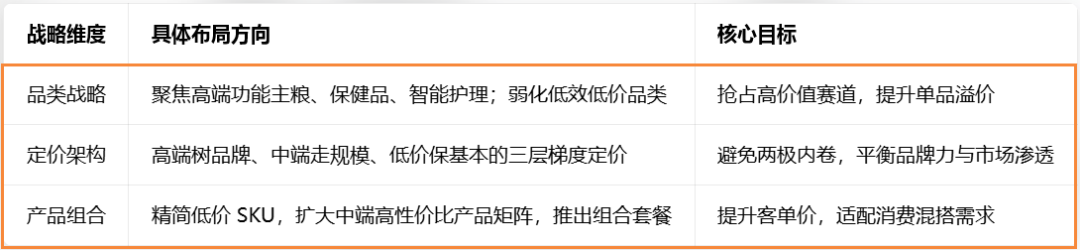 弱化低毛利、低增长的纯低价品类,资源向高端功能主粮、保健品、智能护理等高价值品类倾斜;