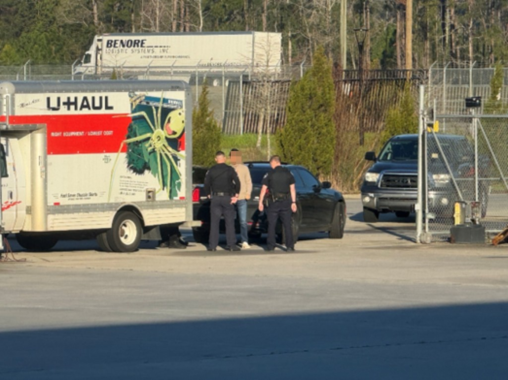 两名警察与一名平民站在一辆U-Haul卡车旁。