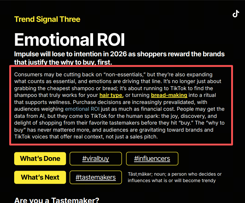 根据TikTok Next 2026趋势报告,全球消费者正在经历一场“情绪投资回报率”(Emotional ROI)的转型。受Chinamaxxing和中式养生风潮影响,市场观察显示,用户正有意识地购买能提升生活质量的‘微基建’产品。