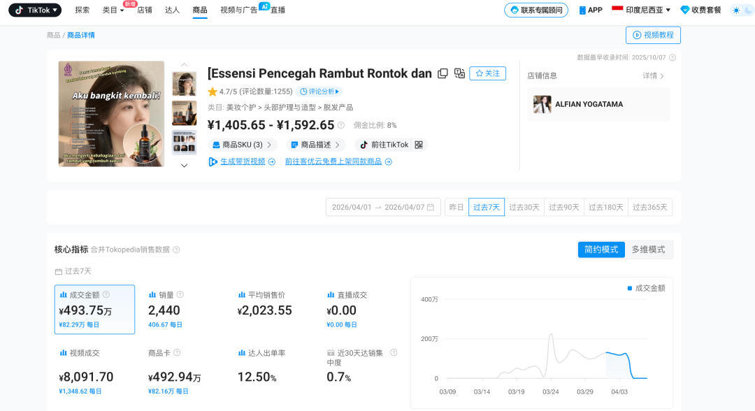 就在这样的需求浪潮里,一款Dr.Lan防脱生发精华液,在TikTok东南亚市场爆火:印尼7天狂卖493万,马来西亚30天斩获1379万GMV。