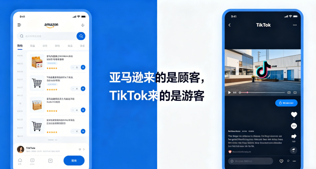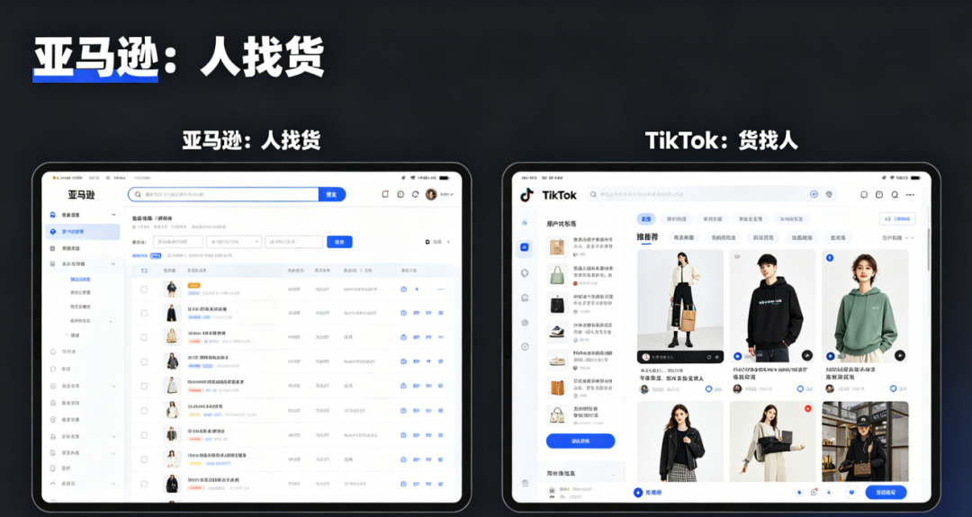 一句话点透本质:亚马逊是“人找货”的刚需搜索电商,进来的都是带着明确购买需求的顾客;而TikTok是“货找人”的兴趣娱乐电商,访问的多是刷视频解闷、被偶然种草的游客