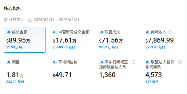 还是以三月数据为例,Wyze品牌TikTok小店的成交额为89.95万美元,其中联盟达人所带来的收益为71.65万美元,占比达到近80%,占据了整个销售环节的大头。