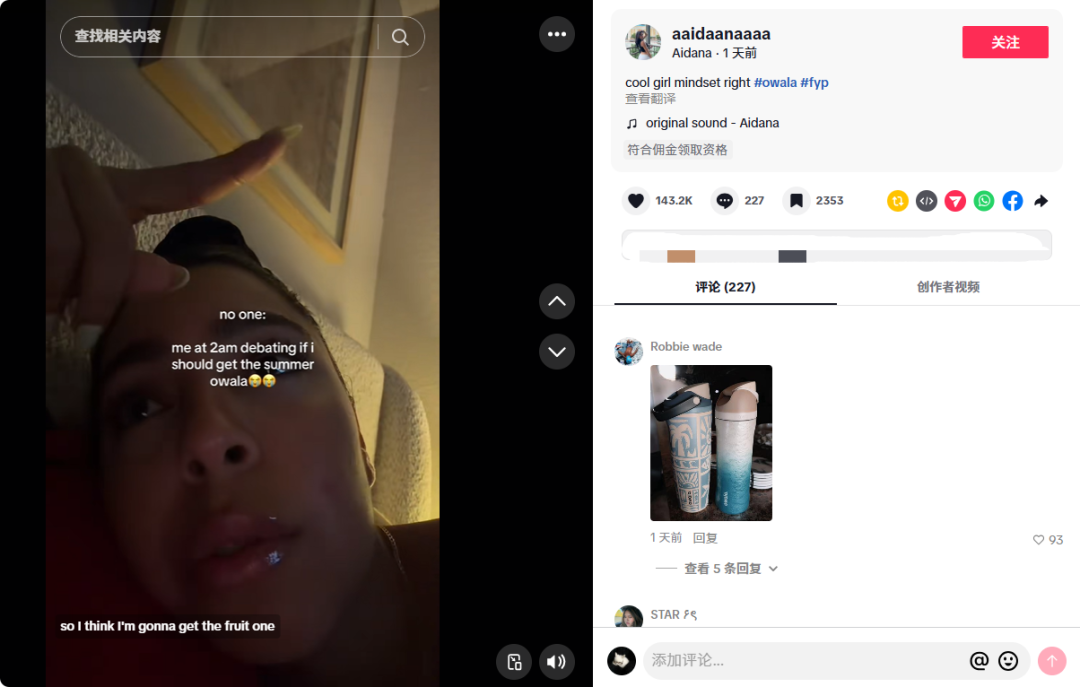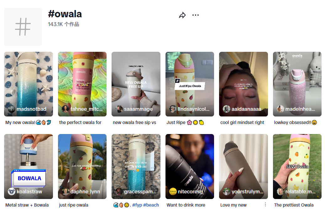 目前,TikTok#Owala标签下已累计超过14.31万条用户创作内容,涵盖开箱展示、配色分享、使用场景记录等各种类型。
