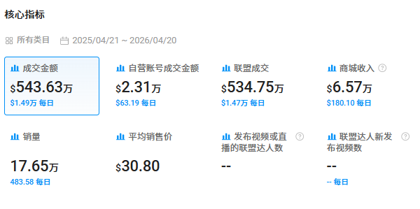 根据平台统计,过去一年(2025年4月至2026年4月),TikTok渠道整体成交金额达到543.63万美元,累计销量超过17.65万件。其中联盟达人贡献了绝大部分成交,这意味着,由用户和达人内容驱动的种草转化,已成为Owala品牌在TikTok渠道最主要的增长来源。