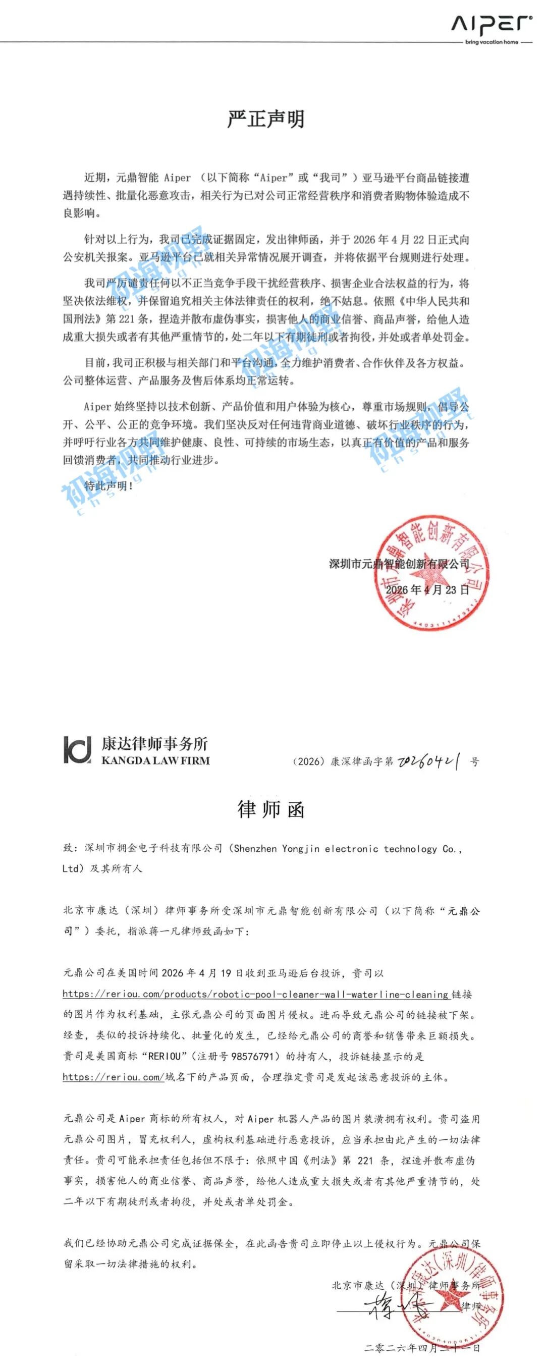 Aiper在律师函中称,