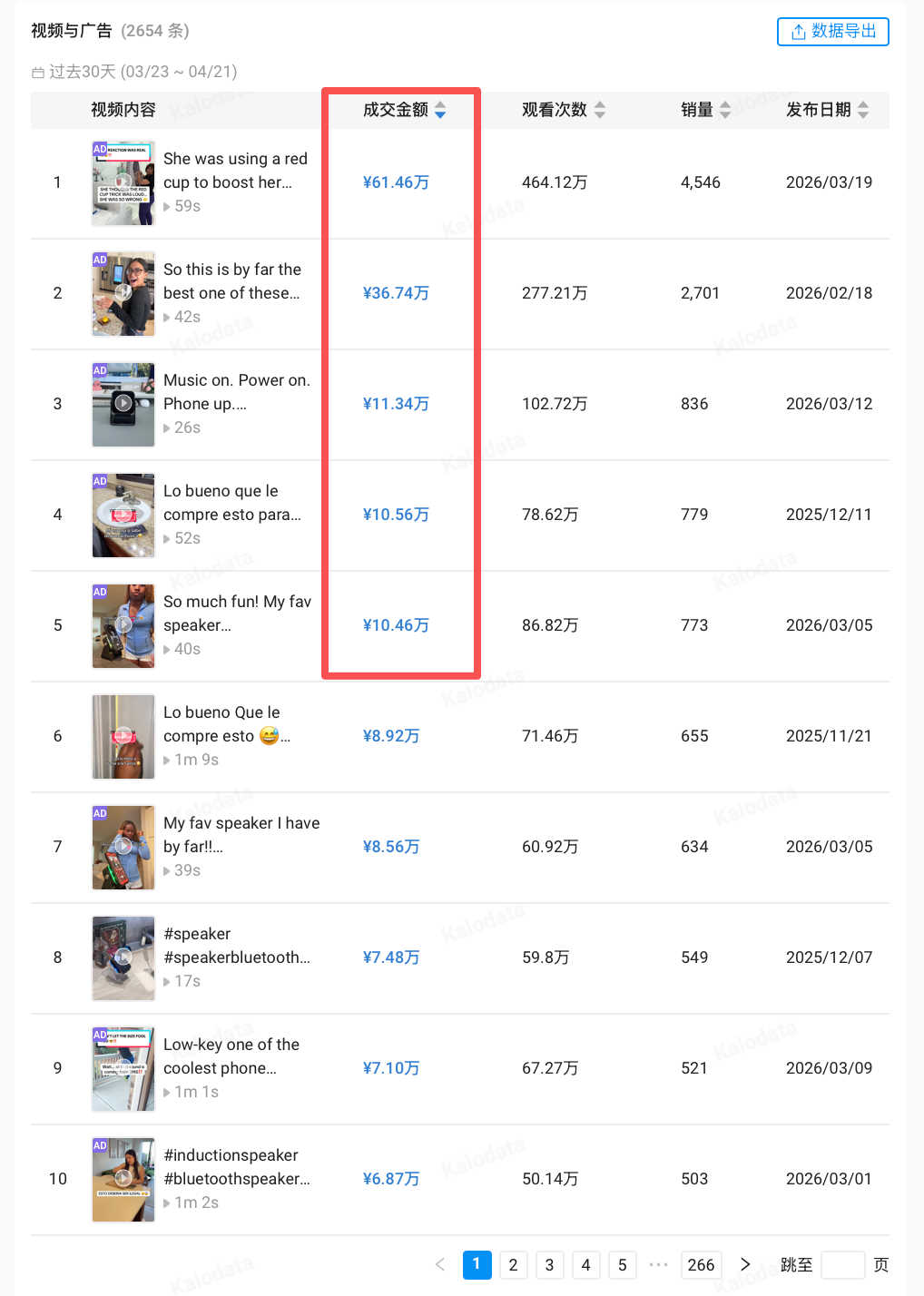 这款感应音箱的持续爆单,核心来自一套可批量复制的高转化视频模板,配合精准的付费投放,跑出了多条 GMV 超 10 万的爆款内容,单条视频最高斩获 460 万 + 的播放、61 万 + GMV,广告 ROAS 高达 3.6。