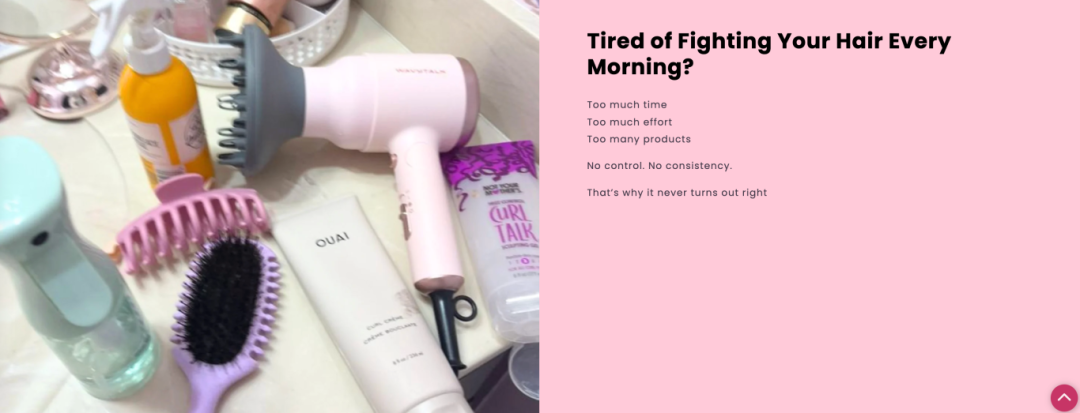 拍摄内容时,不要只干巴巴介绍功能,而是要还原用户的真实痛点场景:比如清晨毛躁头发的尴尬、头皮紧绷的不适感、工具太多的收纳烦恼;再直观展示使用效果:一梳顺滑的发丝、5 分钟搞定的造型、轻松切换的卷发,搭配ASMR 音效,增强沉浸感,让用户“看到自己的影子”,从而激发购买欲。