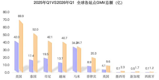 东南亚六国一季度总GMV约191.5亿美元,同比增长103%。泰国以约52亿美元的GMV超过印尼,成为区域第一。
