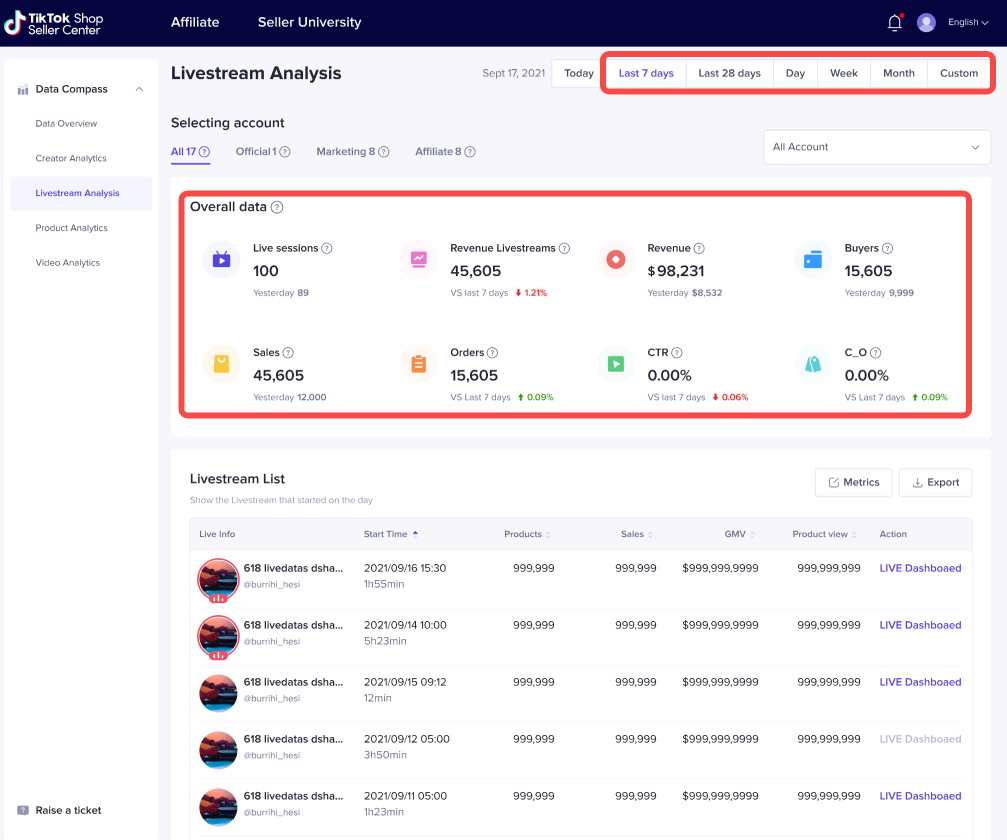 7.Buyers:The number of unique users who paid for orders made from livestreams. When you select the custom period